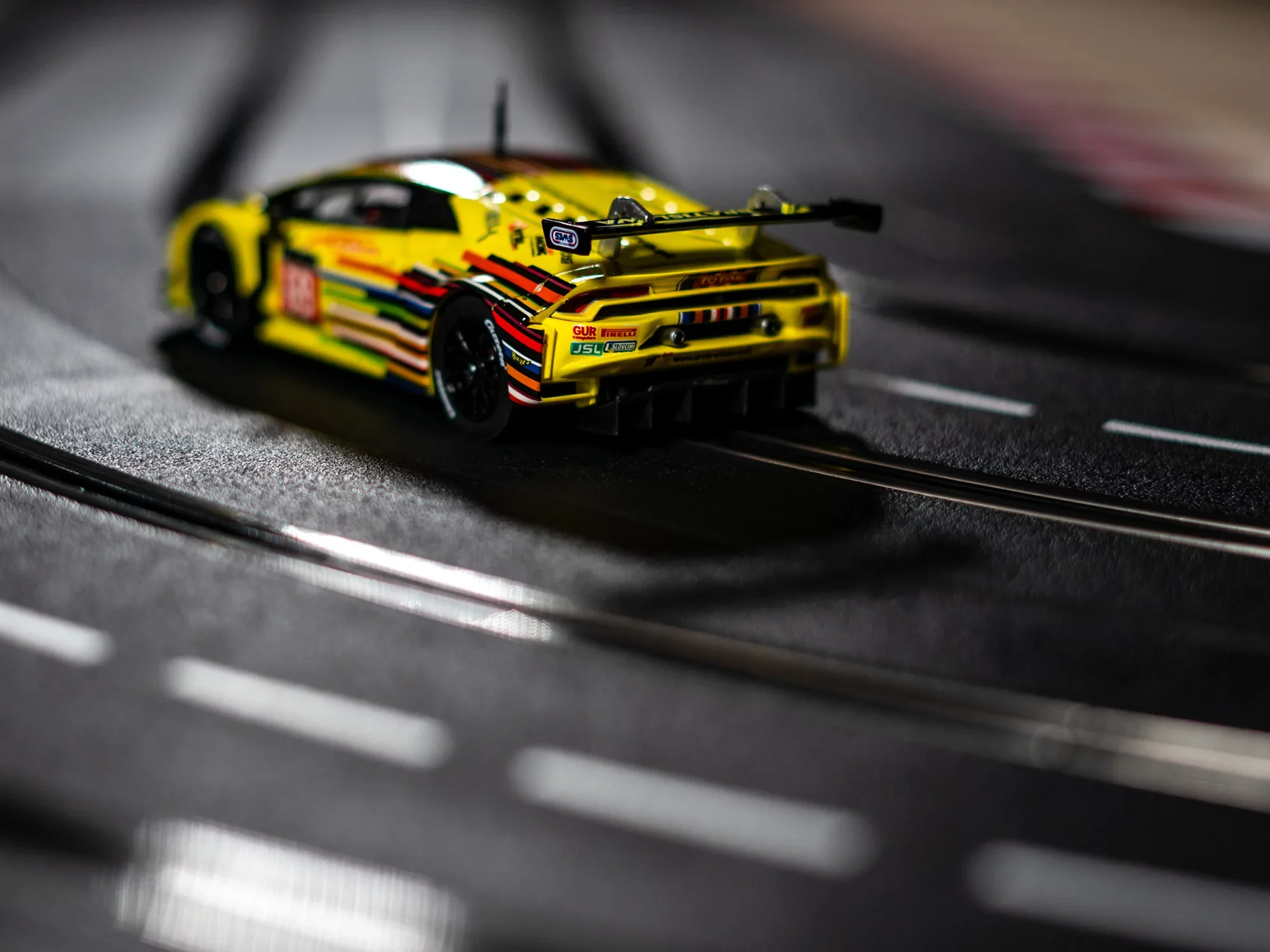 Auch zuhause könnt ihr mit dem Flitzer aus dem legendären italienischen Rennstall richtig durchstarten. Das gelbe Fahrzeug mit der Nummer 69 ist digital steuerbar und individuell codierbar, so dass es auf die Fähigkeiten der Fahrer eingestellt werden kann. Ausgestattet ist das Modell mit Front-, Rück- und Bremslicht.