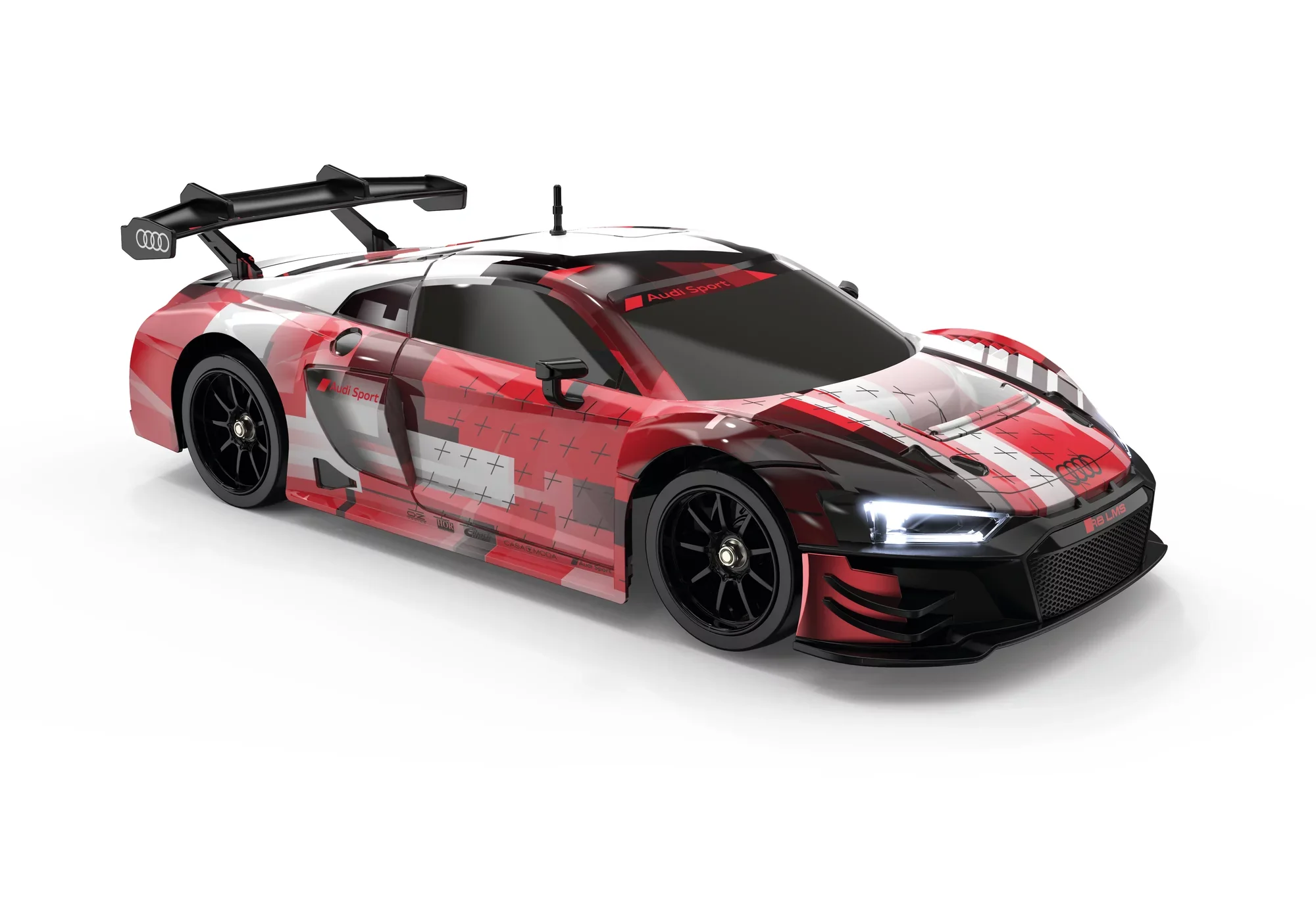 Der Audi R8 in der aktuellen GT3 Ausführung ist ein Dauerbrenner bei allen Fans von schnellen Sportwagen. Wer den Super-Flitzer in seinem privaten Rennstall haben möchte, wird jetzt bei Carrera RC fündig: Der Audi R8 LMS GT3 evo II startet als ferngesteuertes Modell ins Rennen auf der „Heimstrecke". Der schicke Schlitten mit dem großen Heckspoiler macht nicht nur optisch einiges her, auch qualmende Reifen dank der Dampffunktion, die auf Knopfdruck auf der Fernsteuerung ausgelöst werden, begeistern. Zusammen mit dem LED-Frontlicht sorgt der „Qualm" für ordentlich Stimmung im Nachtrennen. Der ca. 28 cm lange Audi R8 ist außerdem mit Vierrad-Antrieb und besonderen zusätzlichen Rädern ausgestattet, so dass er auch mit coolen Drifts und heißen Kurven überzeugen kann. Bis zu 18 km/h Spitzengeschwindigkeit machen ihn zu einem ernst zu nehmenden Gegner beim Rennen drinnen und draußen.