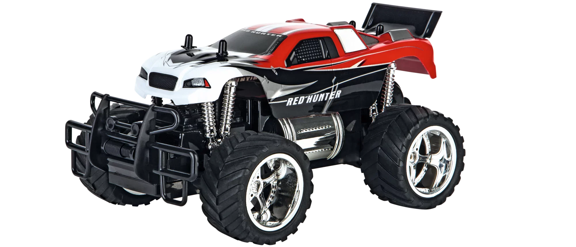Der aufgemotzte Red Hunter X mit extra großen Luftreifen bringt Action ins Kinderzimmer und in den Garten. Mit dem 25 cm langen Offroader und seiner Full Function-Steuerung kannst du präzise und sicher dein Fahrzeug ins Ziel lenken. Das Fahrzeug wird Ready-to-Run, also mit 6x AA (LR06) Batterien geliefert. Damit kannst du sofort die Reifen quietschen lassen und die Rennstrecke unsicher machen. Mit der 2,4 GHZ Technologie kannst du ohne auf die Frequenz achten zu müssen bis zu 16 Fahrzeuge gleichzeitig auf einer Bahn fahren lassen. Also ran an den Controller und gib richtig Gas.