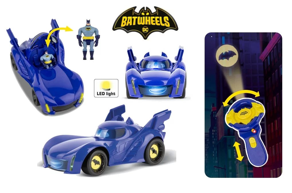 Mit dem Carrera First RC Batwheels™ - Bam starten kleine Helden der Nacht ab 3 Jahren durch. Das lizenzierte Batmobil ist bereit für seinen Einsatz in Gotham City oder im Kinderzimmer und begeistert neben dem coolen Design mit dem ikonischen Bat-Logo in Gelb und Schwarz auch mit einer beweglichen Batman-Figur zum Herausnehmen. Damit Batman sich unerkannt fortbewegt, ist er sicher hinter der Windschutzscheibe des Fahrzeugs verborgen und bleibt so auch sicher im 23cm langen Wagen, wenn es etwas holpriger wird. Ist Batman ohne seinen Schlitten im Einsatz, leuchten Mund und Gesicht des Fahrzeuges. Brauchen die kleinen Helden mehr Unterstützung für knifflige Fälle, nehmen sie die kindgerechte Fernsteuerung zur Hand. Mit der LED-Beleuchtung projizieren sie das Batman-Logo an die Wände des Kinderzimmers.