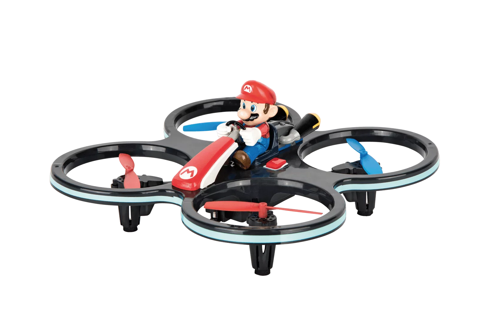 „It´s-a-me - Mario!" Als neues Familienmitglied bei den Carrera RC Mario Kart™ Helden saust der Mini Mario-Copter durch die Lüfte. Der gerade einmal 16,5 x 16,5cm große Quadrocopter mit einem Rotordurchmesser von 5,5cm ist „Ready to Fly" und mit einer 2,4 GHz Digital Proportional Technologie ausgestattet. Dank Spezialfunktionen wie dem Beginner-Advanced Modus, Auto Start- und Landefunktion sowie der automatischen Höhenkontrolle können auch junge Piloten problemlos mit dem kleinen Höhenflieger abheben. Durch den extra stabilen Rotor Protection Cage ist der Mini Mario-Copter auf seinem bis zu 7 minütigen Flug bestens geschützt. „Mamma mia!" Hier ist Flugspaß garantiert!
